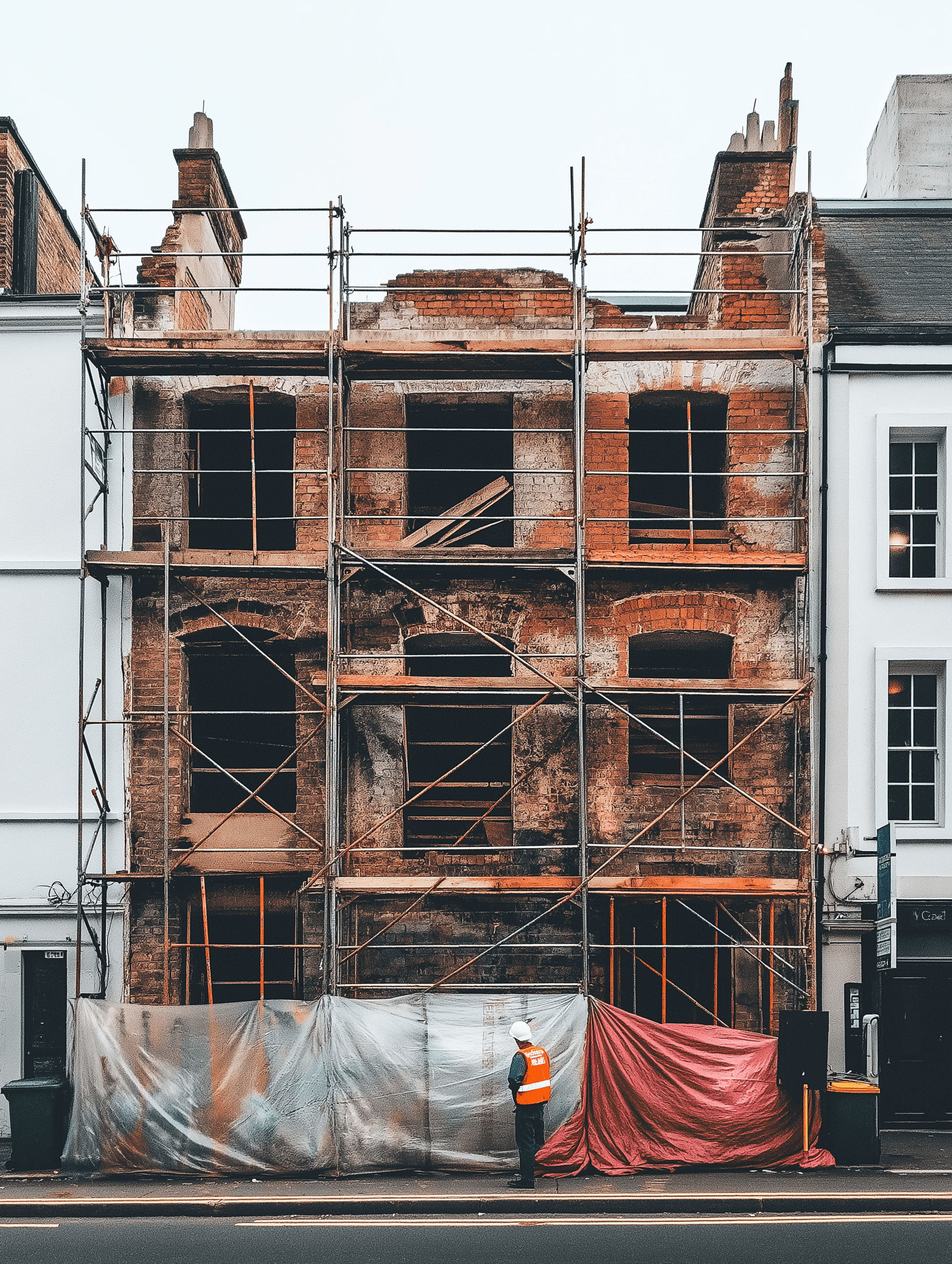 An old building covered in scaffolding and tarps, with workers repairing it, symbolizing the renewal and preservation aspect of construction