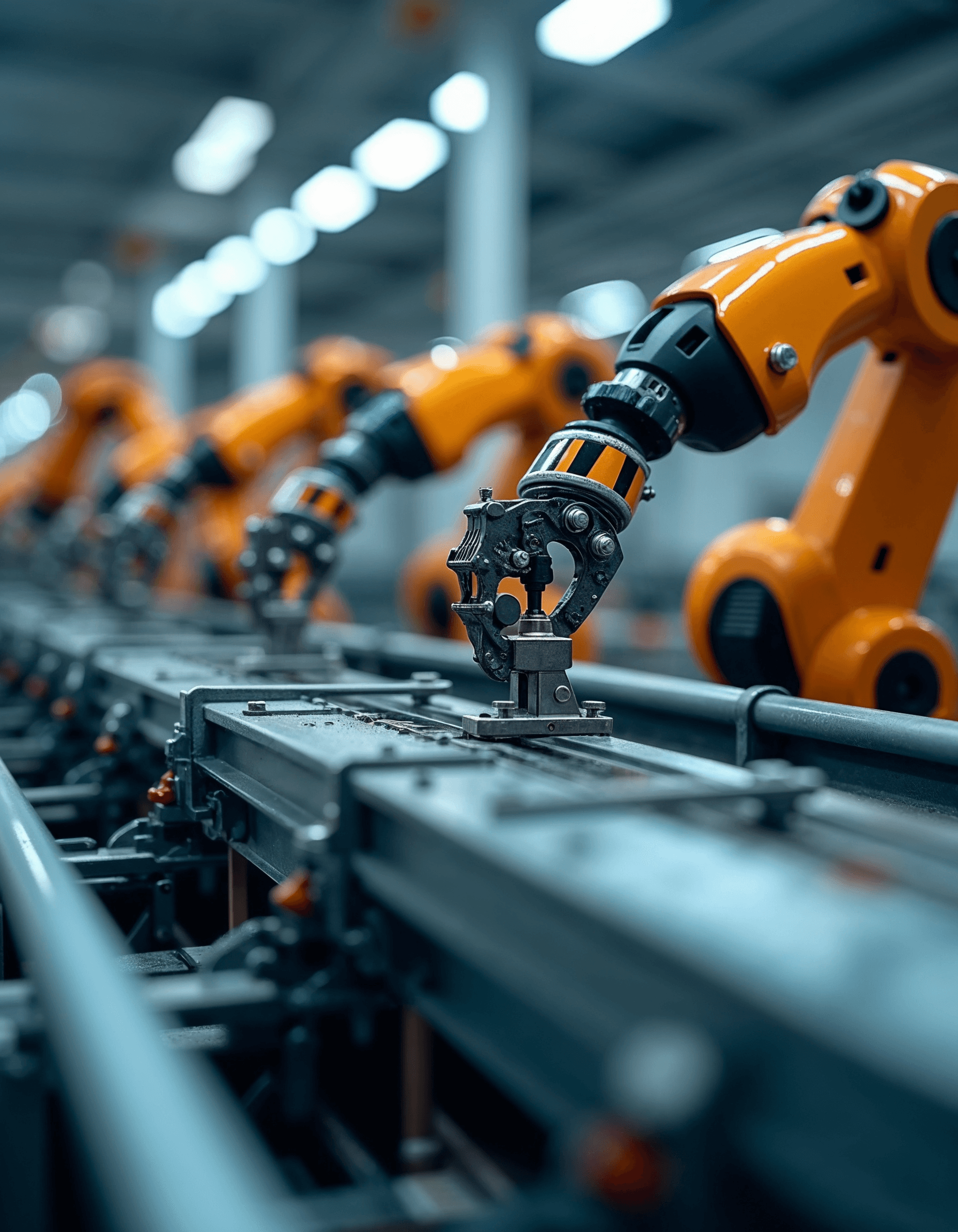 Close-up of robotic arms performing intricate tasks on an assembly line, illustrating the increasing automation in heavy industry