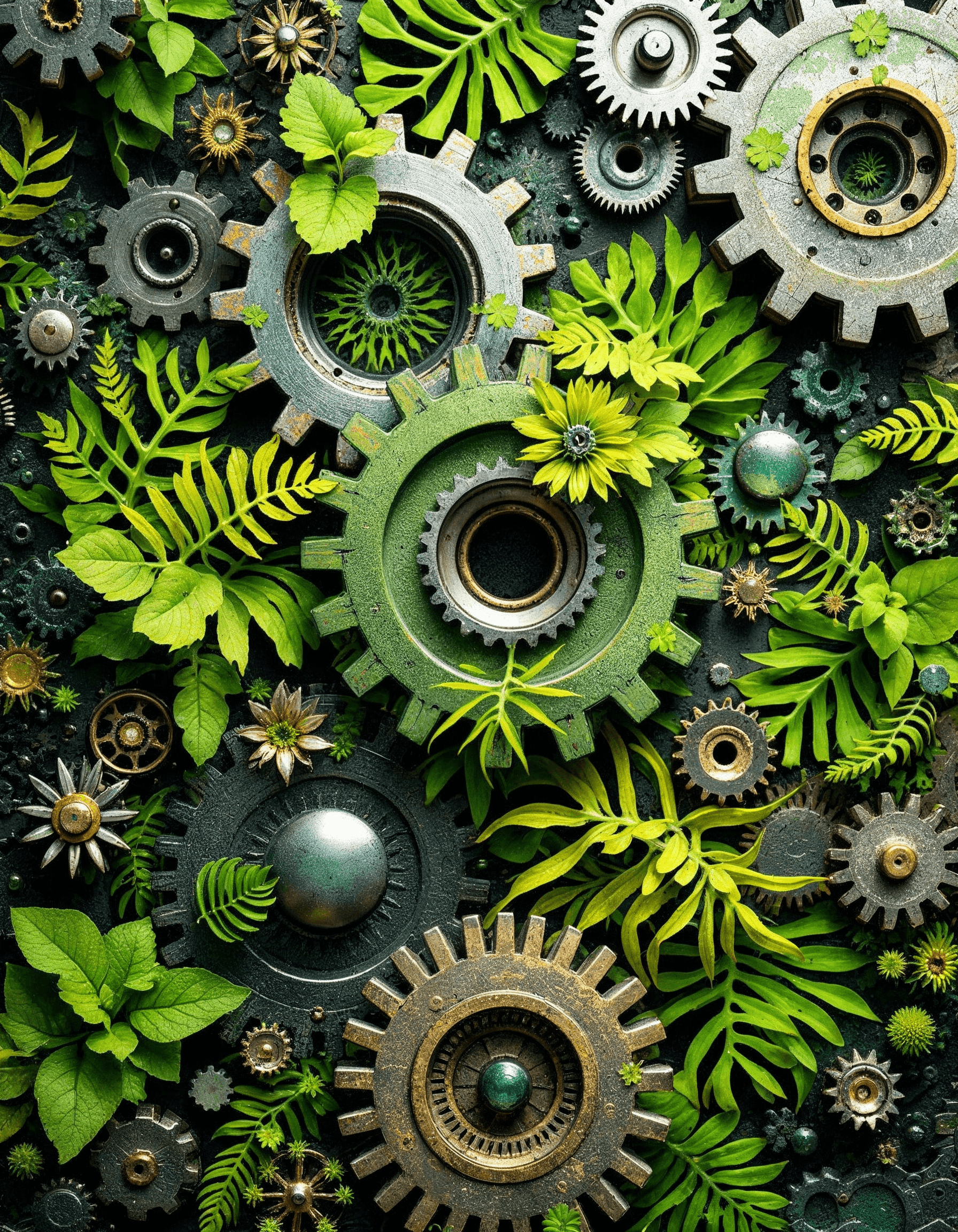 Gears and mechanical shapes in metallic finishes blend seamlessly with plant-like abstract forms in vibrant greens