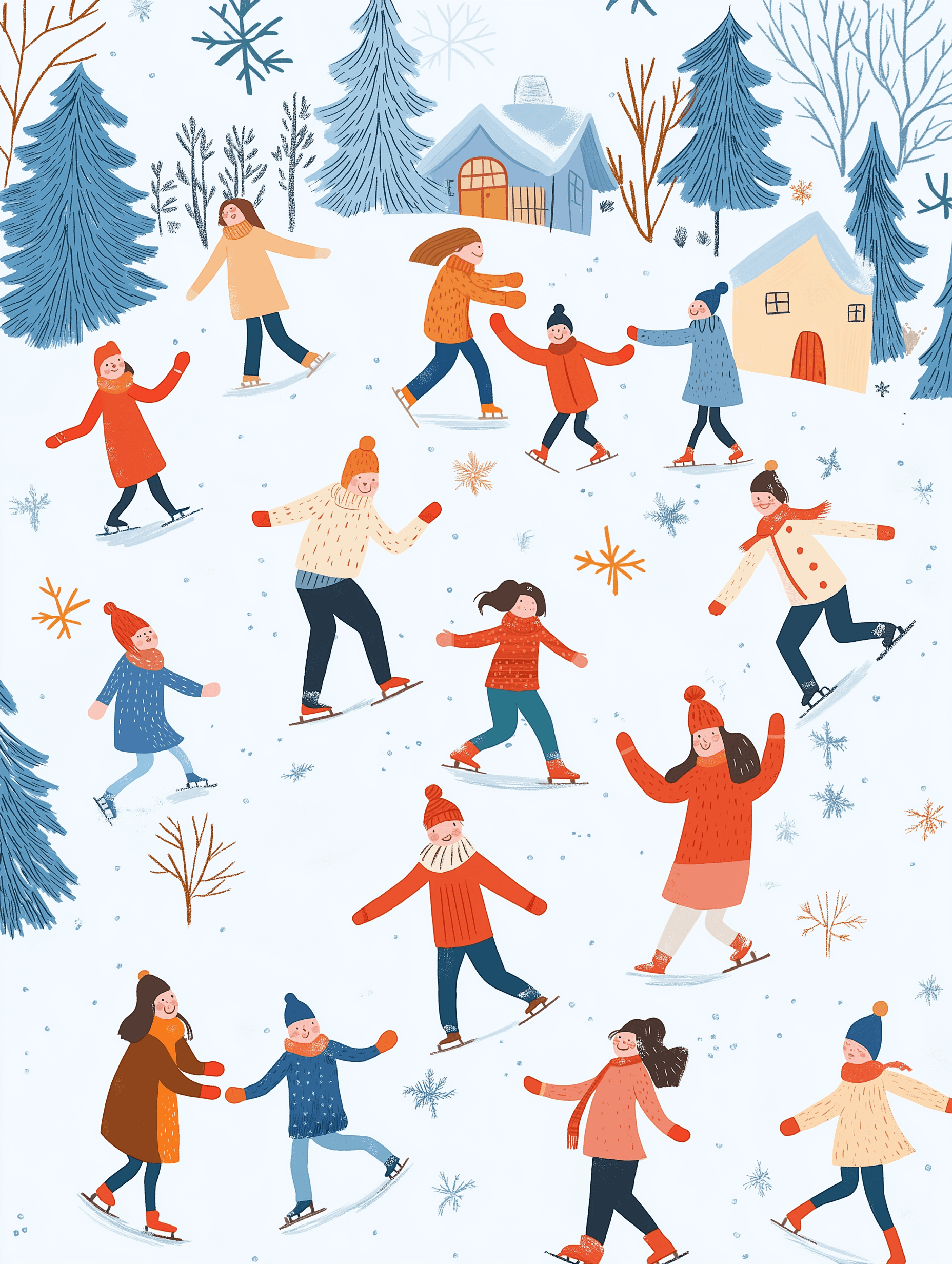People skating on a frozen lake, dressed in warm clothing like beanies, scarves, and mittens