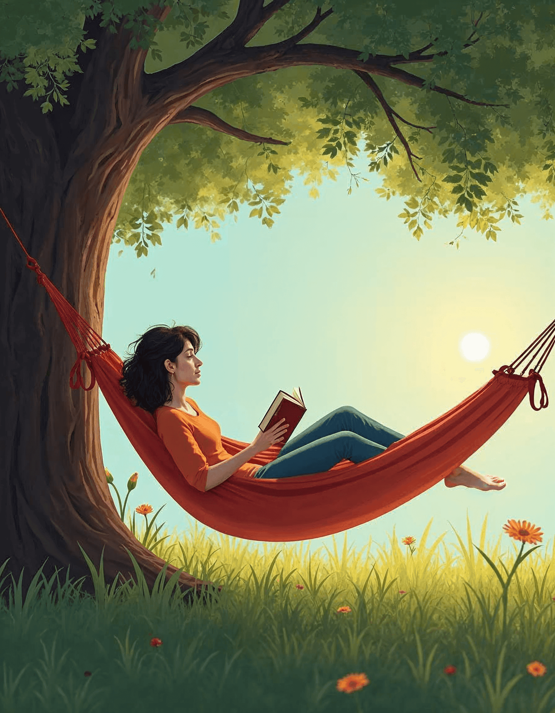 Person reading a book in a hammock under a shady tree, represents the peace and relaxation that comes from engaging with literature and nature