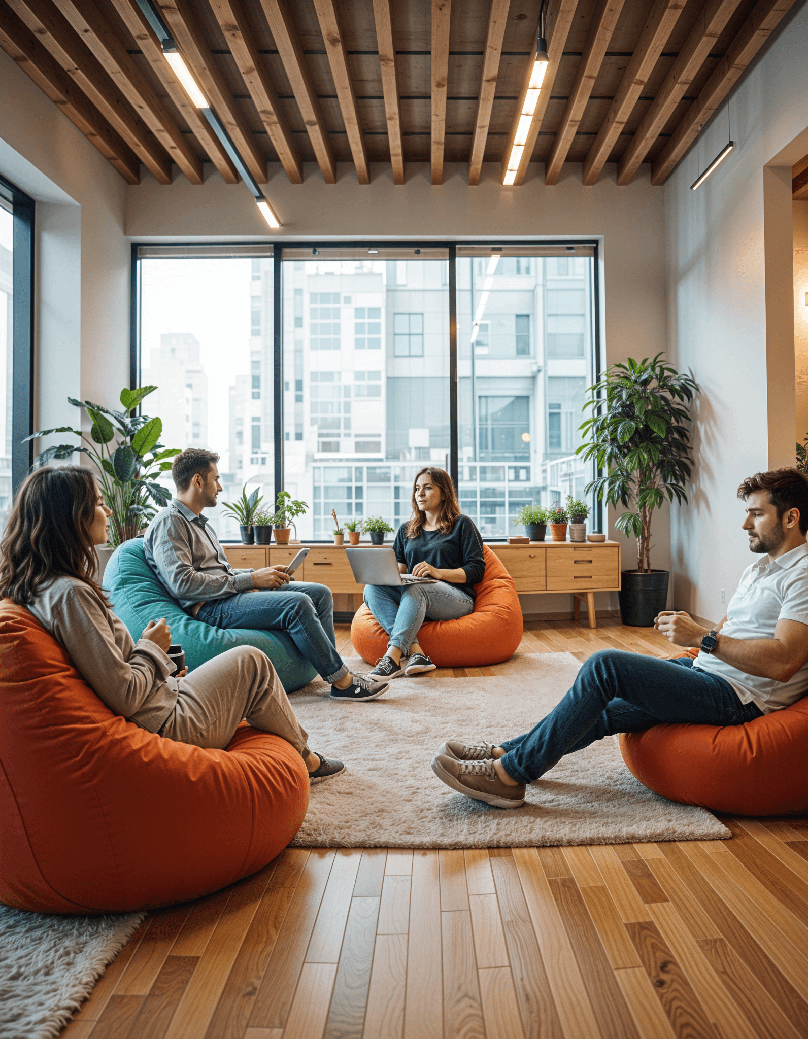 Modern tech offices prioritize employee wellness with relaxation zones featuring beanbag chairs, games, and snacks—key perks that enhance work-life balance.