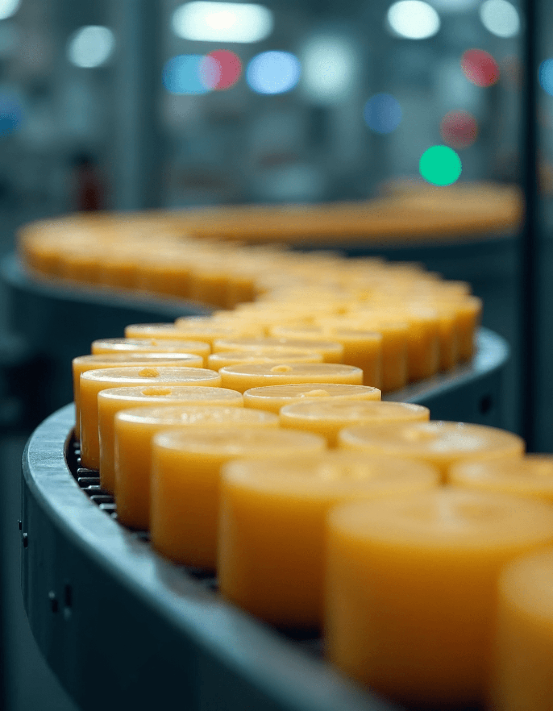 Rows of identical products moving along a conveyor belt, highlighting the mass production aspect of heavy industry