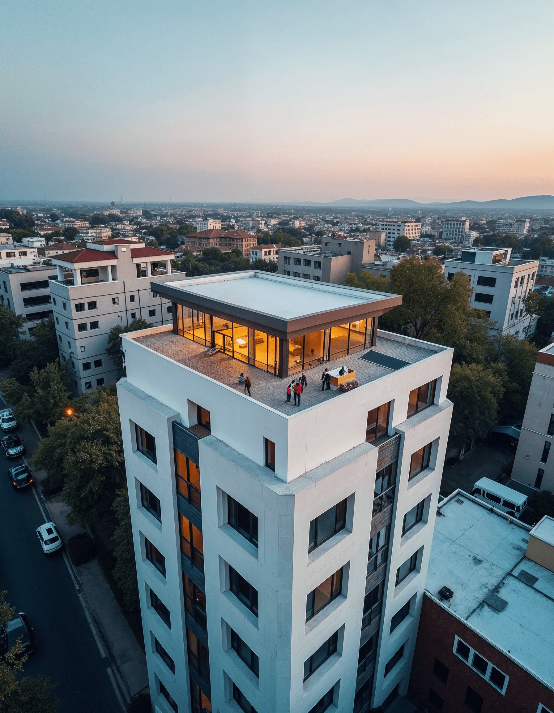 Shoot from a high vantage point, like a rooftop or a drone, to capture a building’s overall form and its relationship to the surrounding environment