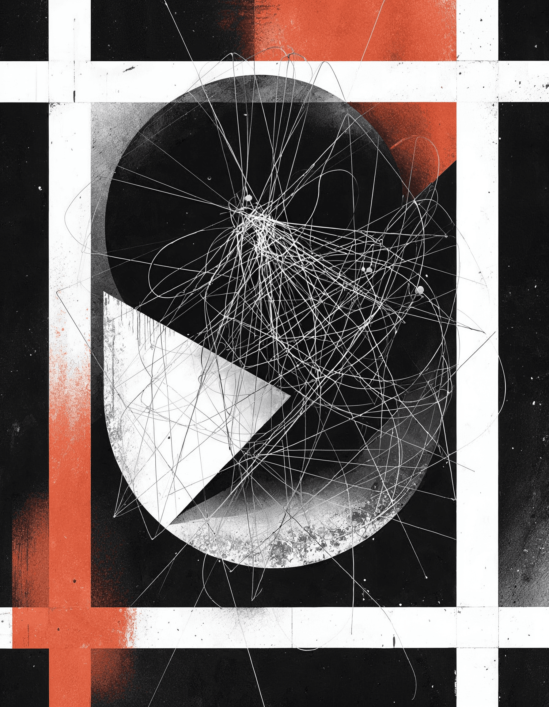 Tangled strings of fine, thread-like forms wrap around bold, heavy geometric shapes, creating tension