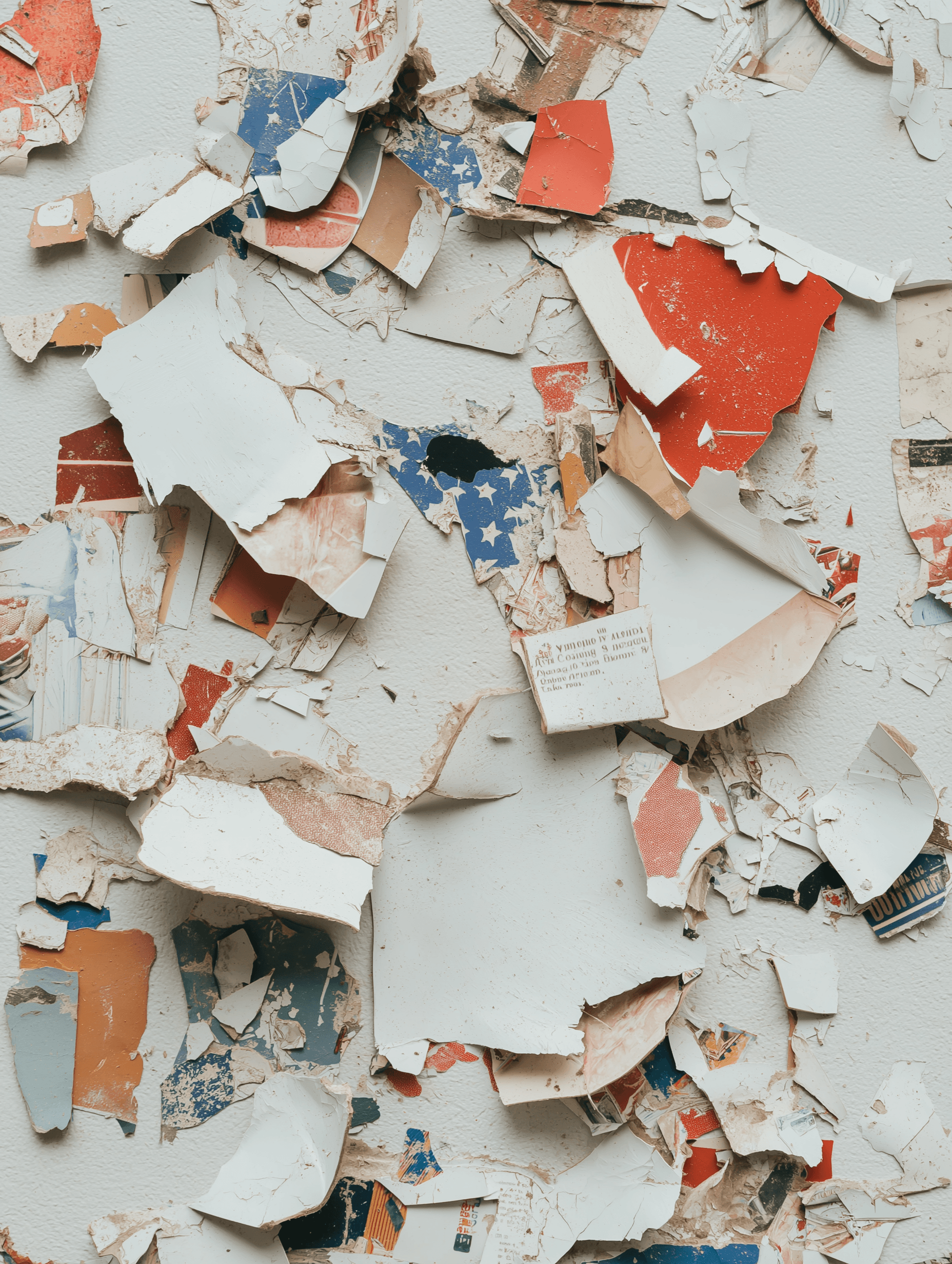 Torn political campaign posters scattered on a wall, symbolizing political rivalry, lost campaigns, or change