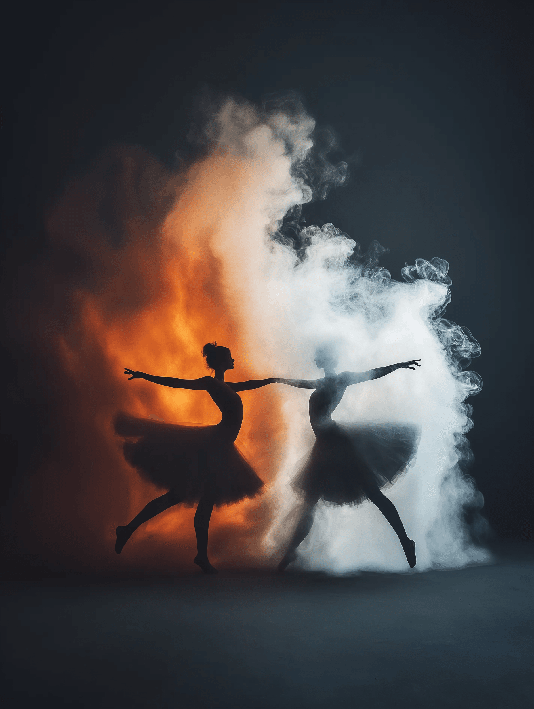 Two ethereal dancers—one crafted from billowing smoke, the other from flickering flames—perform an eternal dance, spinning in perfect harmony yet forever apart.