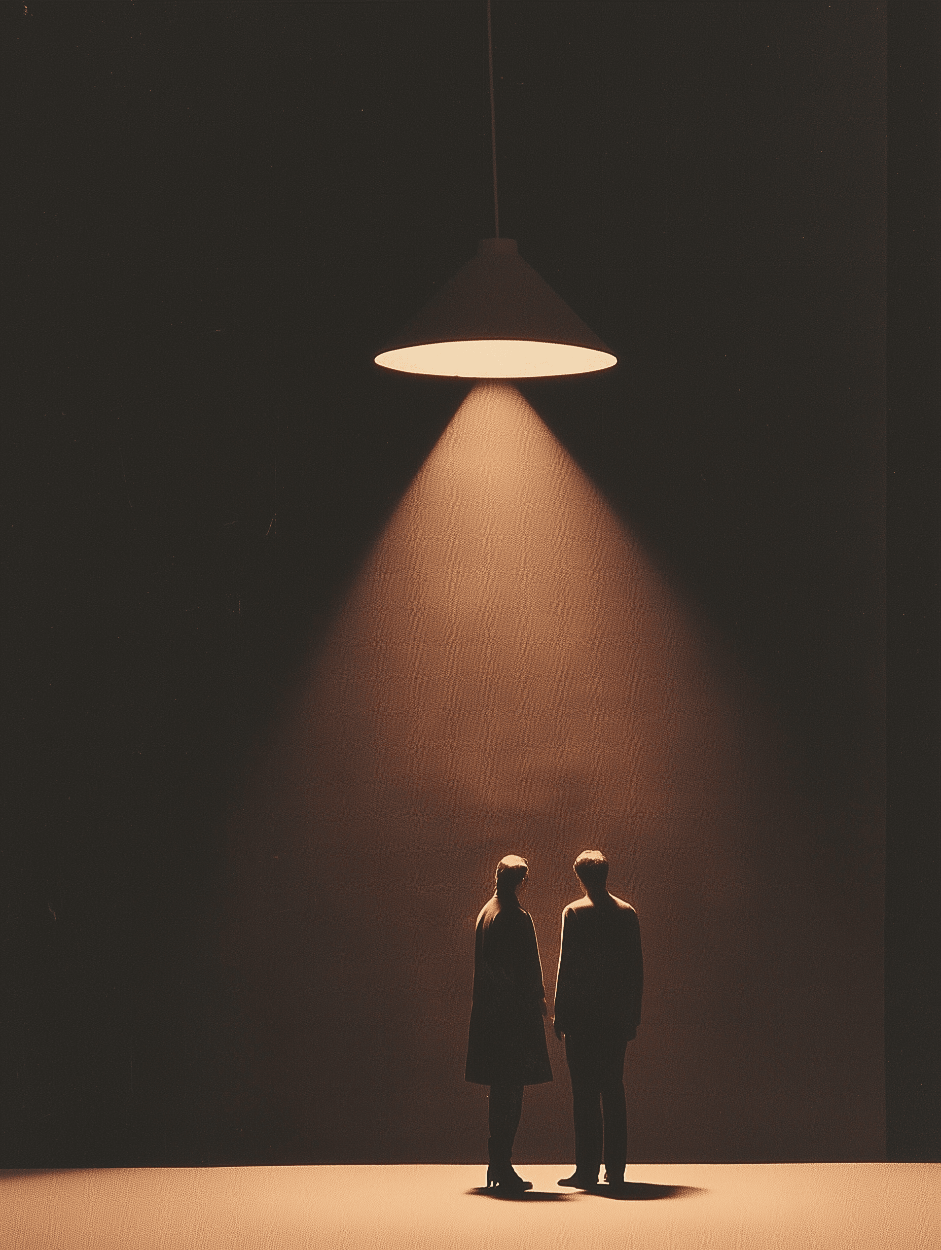 Two people sharing a single spotlight, each illuminating the other, symbolizing mutual recognition and support in close relationships