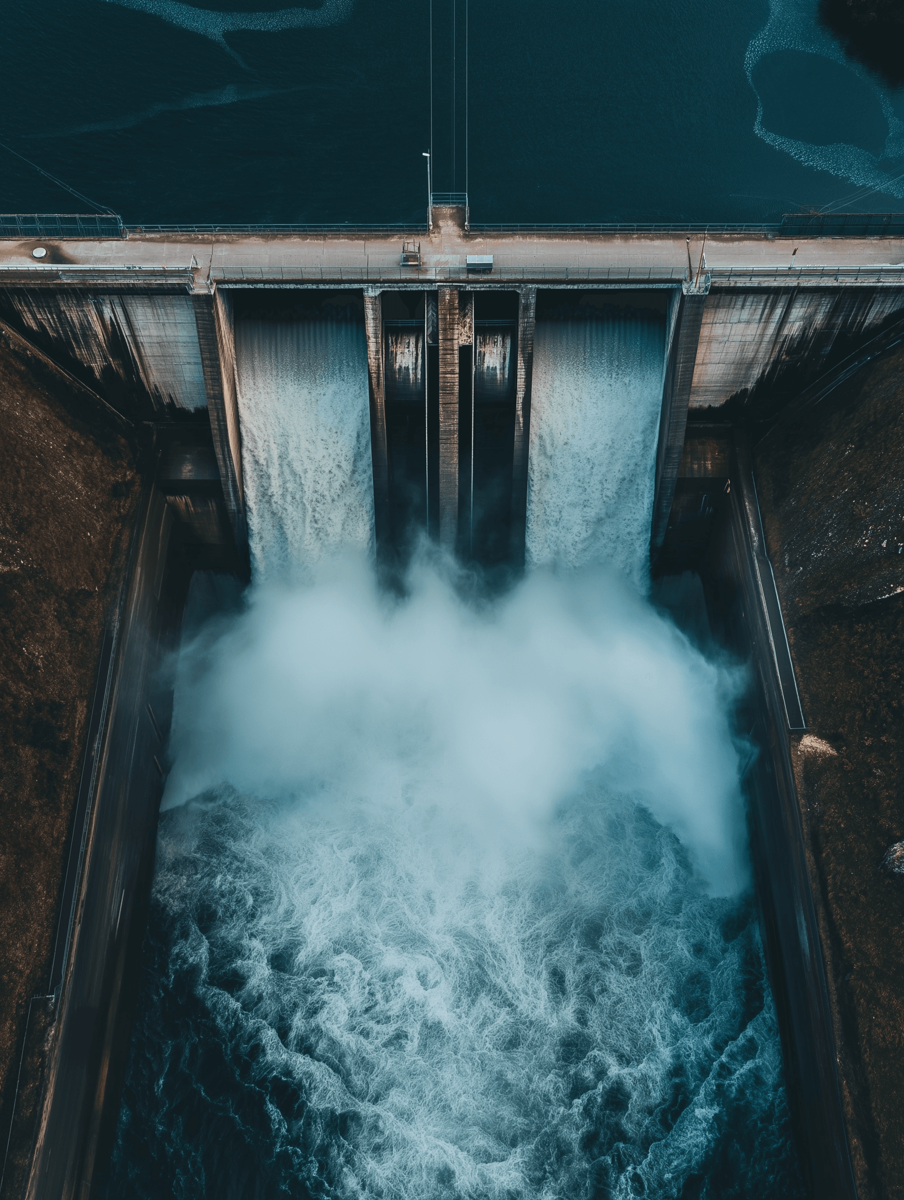 Water rushing through a hydropower dam, symbolizing the power of water as an energy source